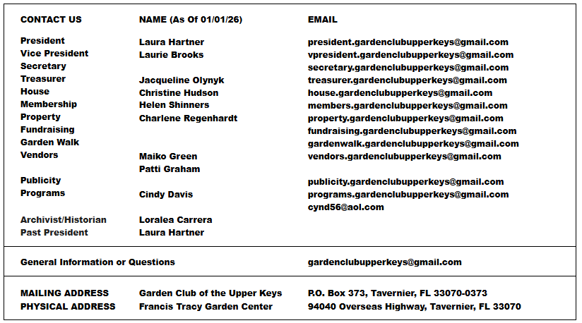 The Garden Club of the Upper Keys, Inc. is a qualified 501(c)(3) educational organization registered in the State of Florida, registration #CH37407. All donations are tax deductible to the extent permitted by law.